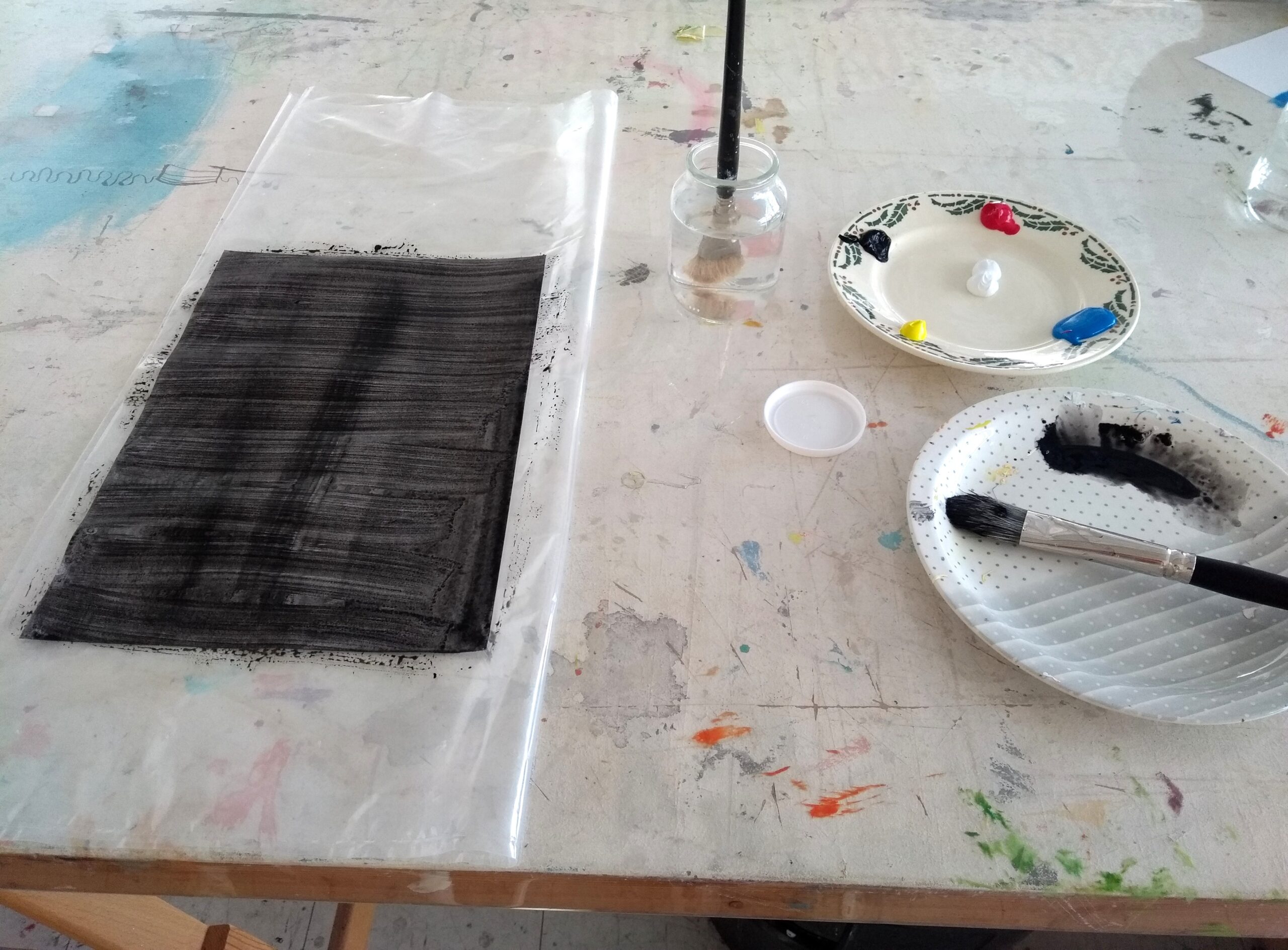 Le groupe. Des jeunes, très jeunes, des plus âgées, beaucoup plus âgées, des évaluées entre deux âges. Un seul représentant du sexe masculin, tiens ? Nous sommes assis autour de la table professorale, la salle est orientée plein sud, je savoure la douce chaleur qui a envahi l’ancienne classe de collège. Rapide tour de table. « Et toi ? » « Transfuge du cours de photo » J’écoute d’une oreille semi-attentive la présentation pédagogique, et, comme à l’école, je fais passer à mes voisines, de droite ou de gauche, les reproductions artistiques. Mon cerveau exulte dans cette ambiance quasi scolaire que j’aimerai profondément, jusqu’à mon dernier souffle, si tant est que je puisse souffler à cet instant précis autant que fatal. Puis, présentation des outils, de l’espace du cours. Nous allons appliquer, sur un fond coloré ou non, les bandes d’une couleur, déclinée dans ses nuances, ses valeurs, ses dégradés. J’ai l’air d’en connaître un rayon en vocabulaire technique mais je viens de le consulter en ligne … Je commence par un format A4 à couvrir d’inspirations personnelles. Petit format pour petites ambitions. Je suis novice dans l’art d’appliquer la couleur avec réussite. Tout le monde se précipite sur, les couleurs primaires à mélanger, les vieilles assiettes faisant office de palettes et les pots d’eau. Il fait chaud, je suis bien, j’attends patiemment mon tour.