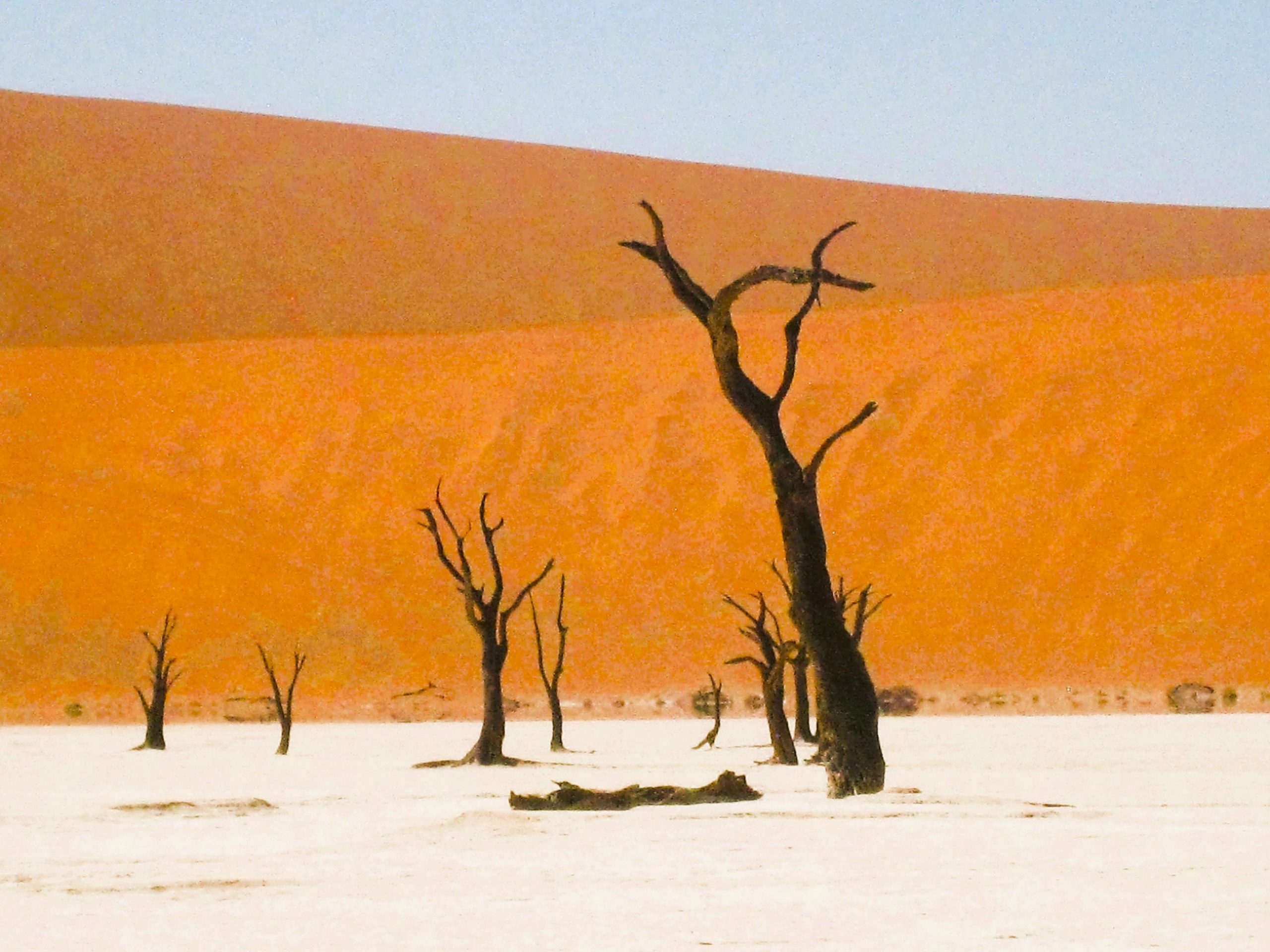 Mais, il y a encore plus difficile et torride, la marche sous le soleil écrasant et dans le sable ennemi vers le mythique Dead Vlei, « marais mort », Graal ultime des photographes. Cette cuvette d’argile blanche, que j’imaginais d’ailleurs plus large, est jonchée d’arbres morts fossilisés et centenaires, dans un étrange ballet immobile. La sueur coule sous mon chapeau, le long de mes tempes, sur mes joues. Je crapahute, je bois une gorgée d’eau, je geins, je crapahute, je bois une gorgée d’eau, je geins. J’arrive à la cuvette, quasi zombifiée. Je voudrais la parcourir pour réaliser le cliché du siècle mais une soudaine envie organique me prend. Du monde, pas de buissons … Je rebrousse illico chemin avec quelques pauvres images surexposées mais ce n’est pas si grave, j’ai perdu mon enthousiasme effréné pour la photographie. Après un retour qui m’a semblé une éternité, je les atteins enfin, ces cabanes de bois si caractéristiques du tourisme namibien de désert …
